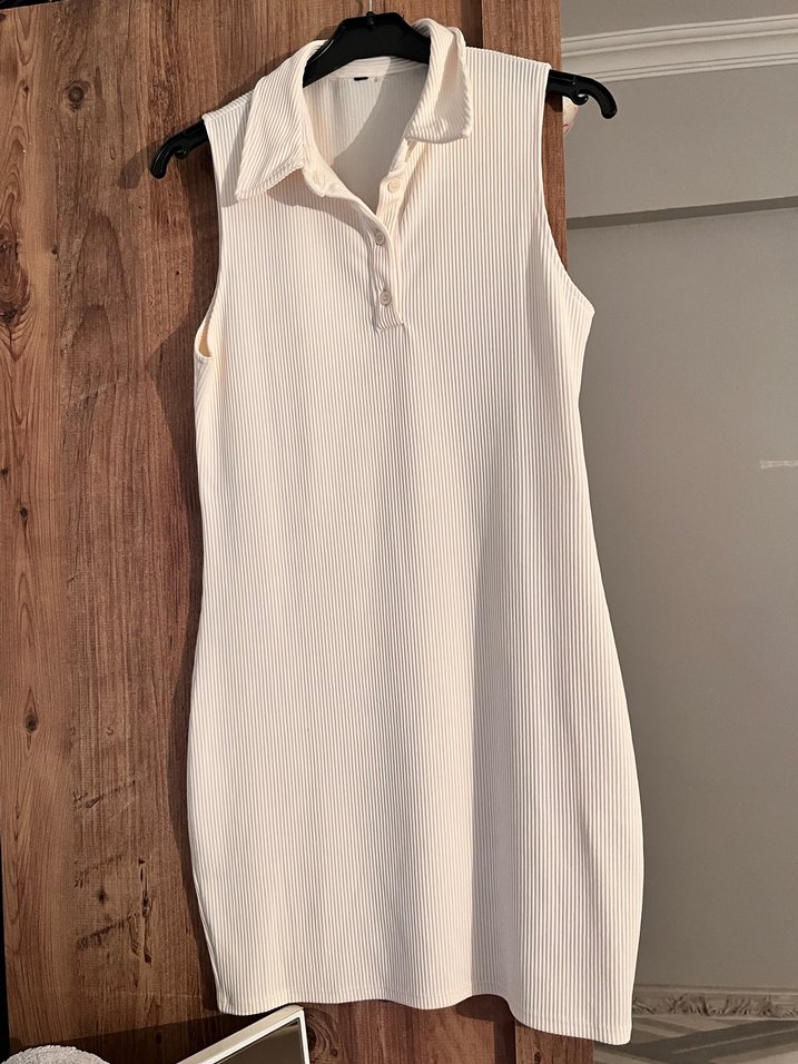 Beyaz, kolsuz midi elbise, yakalı ve yumuşak sentetik kumaştan üretilmiştir. Trendy günlük kombinler için uygundur.
