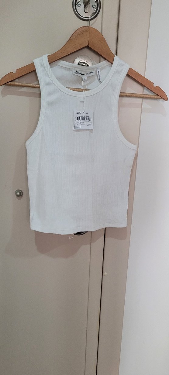 Beyaz kolsuz mini atlet, dar kesim ve yuvarlak yakaya sahip. Yumuşak sentetik kumaştan, günlük kullanım için uygun. Crop hiç giyilmedi