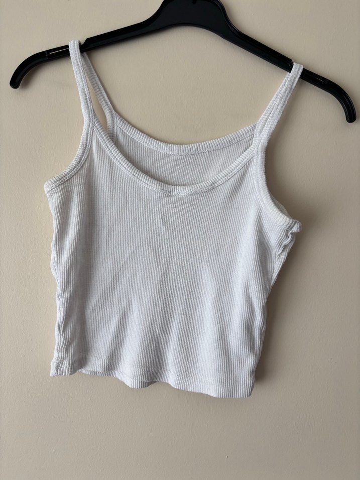 Beyaz, kolsuz, ince askılı, kısa kesim ve tek renk kadın atlet. Yumuşak keten kumaştan, sade ve günlük kullanıma uygun.