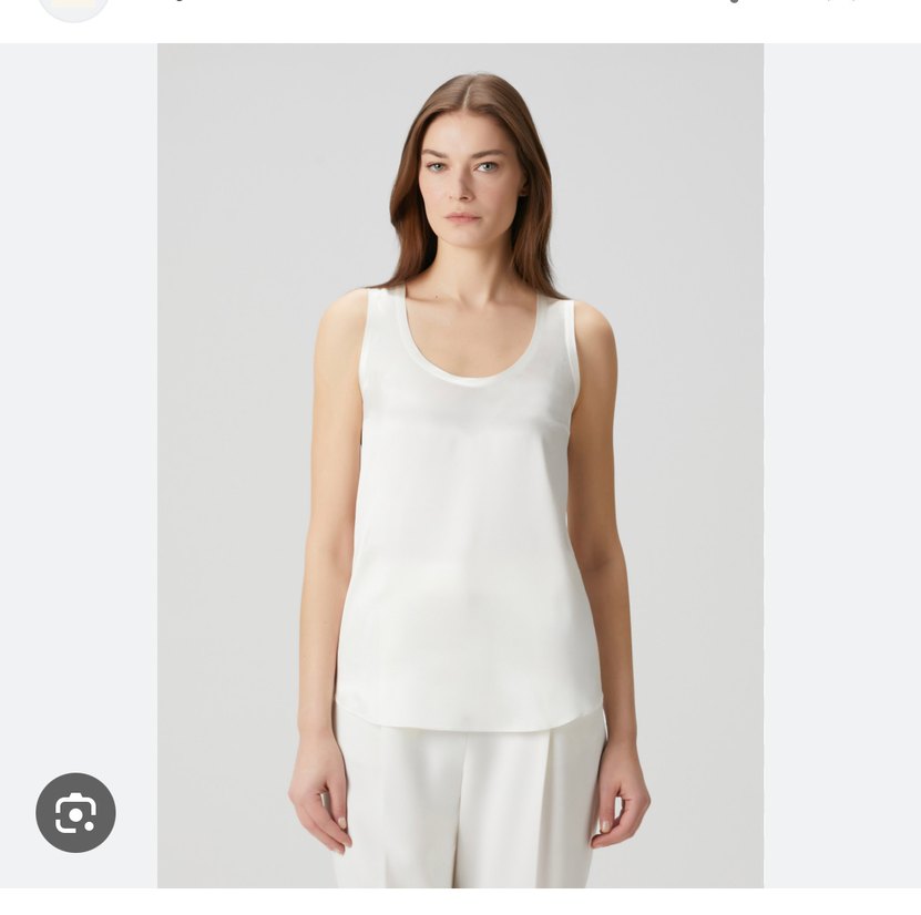 Beyaz kolsuz mini bluz, yuvarlak yaka ve regular fit ile. İpek kumaştan, minimalist tarzda günlük kullanıma uygun.