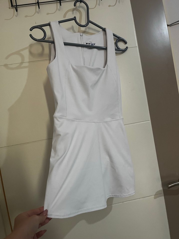 Beyaz renkli, kolsuz ve straplez tasarıma sahip kısa mini şortlu elbise. Düz ve şık, yumuşak sentetik kumaştan üretilmiştir, günlük kullanım için uygundur. aslında tenis elbisesiydi ama ben kestirerek günlük elbise haline çevirdim