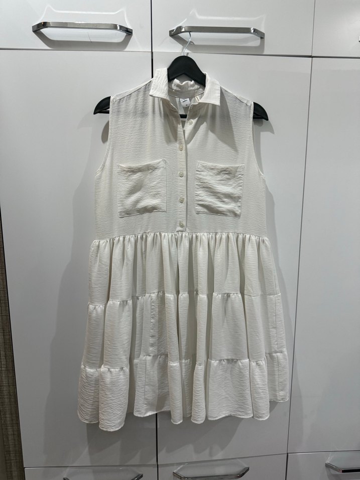 Beyaz kolsuz mini elbise, pilili detaylarla gevşek kesim, yakalı ve düğmeli ön tasarıma sahiptir. Hafif keten kumaştan, günlük bohem stil için uygundur.