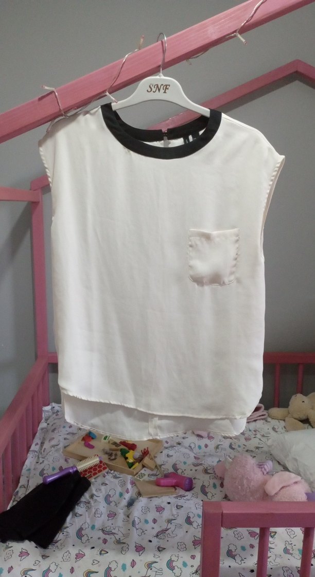 Kruvaze yaka ve salaş kesime sahip beyaz kolsuz bluz, yumuşak sentetik kumaştan üretilmiştir. Ön kısmında küçük cep bulunur, günlük kullanıma uygun şık tasarım. SNF etiketi mevcuttur.