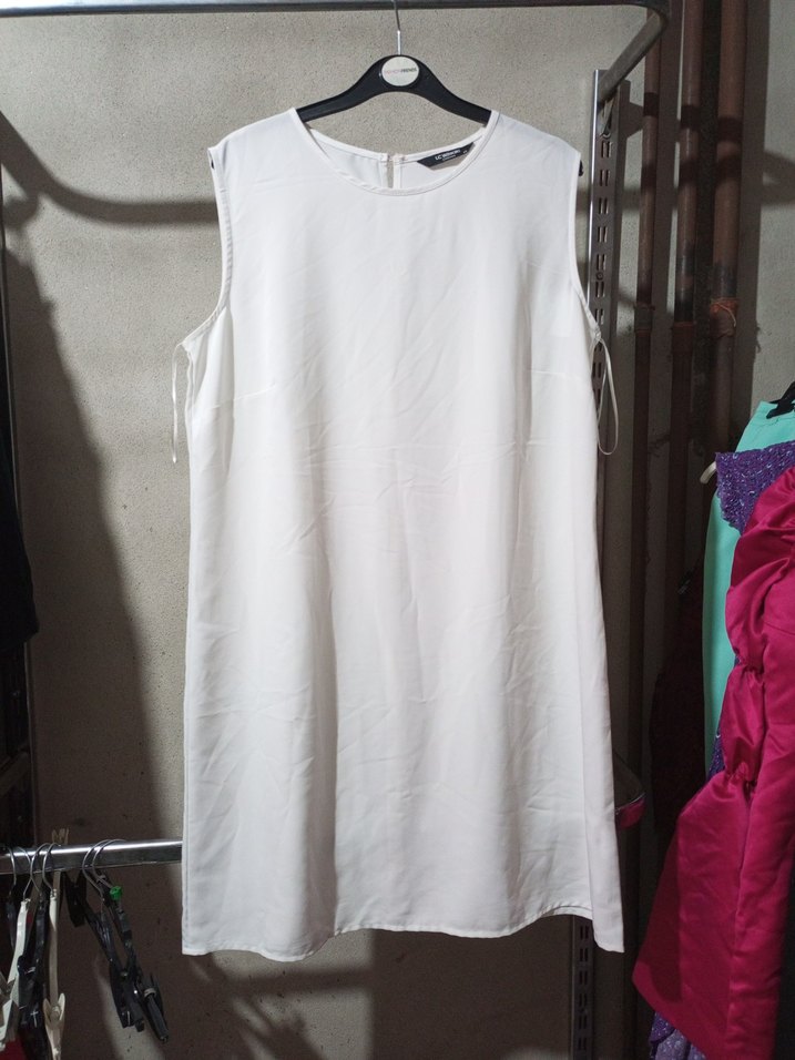 Kolsuz, yuvarlak yakalı beyaz midi tunik , bol kesim ve sentetik yumuşak kumaştan. Minimalist tarzıyla
