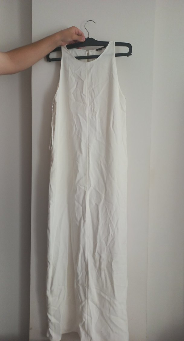 Keten kumaştan, kolsuz, beyaz uzun elbise. Drapeli ve V yakalı, normal kesim sade tasarım, günlük kullanıma uygun.