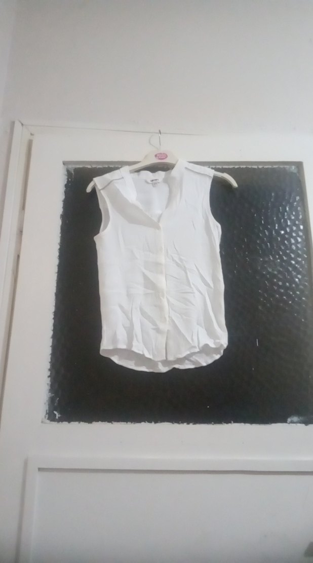 Keten kumaştan, kolsuz ve V yakalı beyaz, ince kesim bluz, günlük rahat şıklık için idealdir.