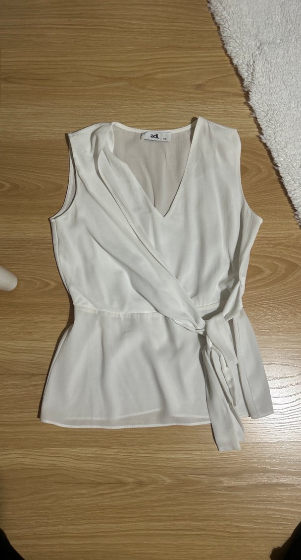 Kolsuz, V yakalı ve kuşaklı beyaz bluz, ipeksi kumaştan, bol kesim ve midi boyda. Minimalist, desensiz tasarımıyla günlük kullanıma uygundur. S bedene uygun