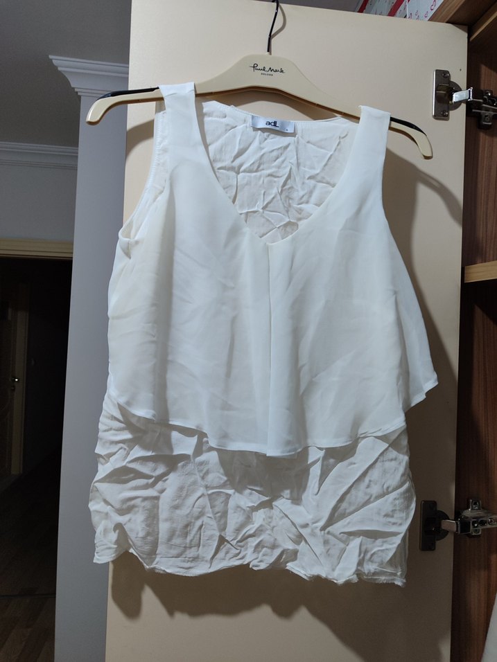 Beyaz renkte, keten kumaştan yapılmış kolsuz, V yakalı, salaş kesim midi boy bluz. Fırfır detaylarıyla günlük sokak stiline uygundur.