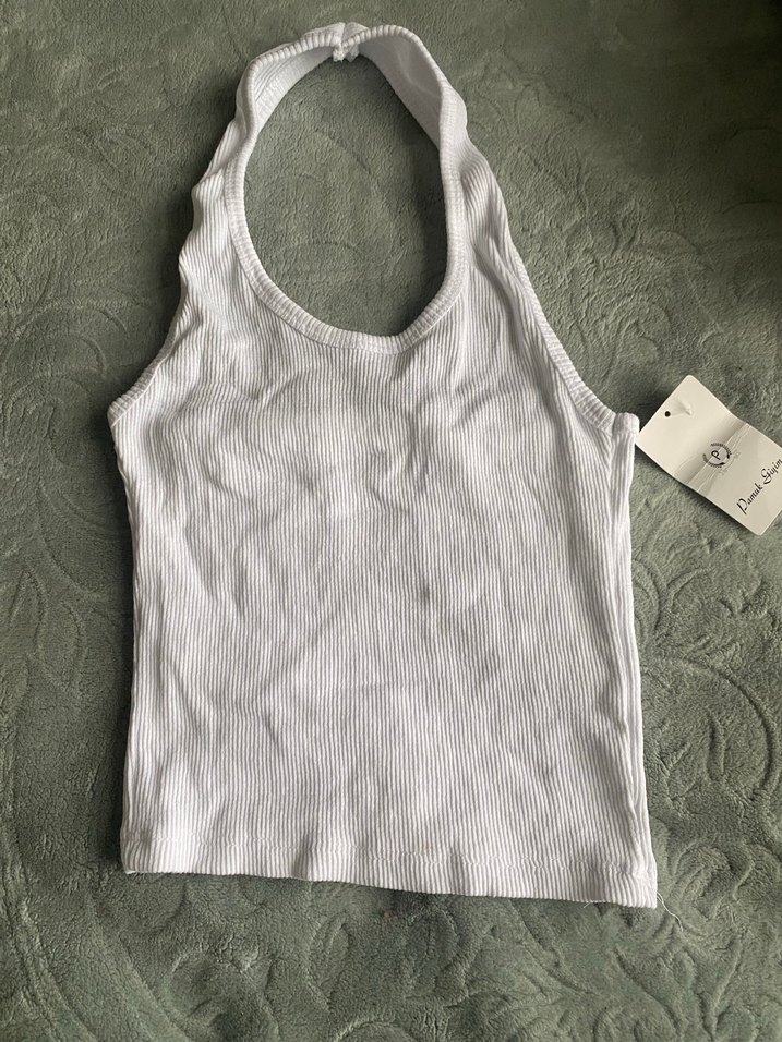 Beyaz, kolsuz, yüksek yakalı ve ince kesimli kadın atlet, yumuşak keten kumaştan, minimalist sokak stili için uygun.