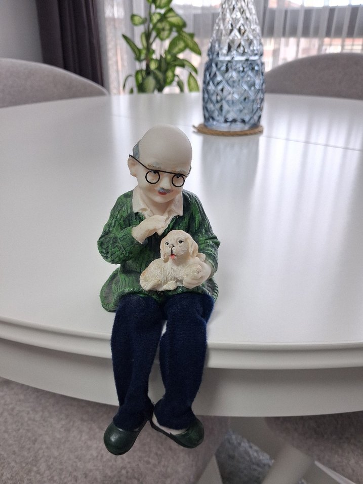 Gözlüklü yaşlı adam figürü, kucağında küçük beyaz köpek tutuyor. Detaylı kıyafetlere sahip, bacakları sarkık şekilde oturuyor.