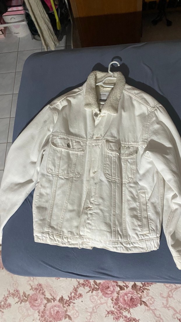 Bershka içi full yünlü aşırı sıcak tutuyor , beyaz kot ceket, düğmeli ve yakalı. Salaş kesim ve uzun kollu