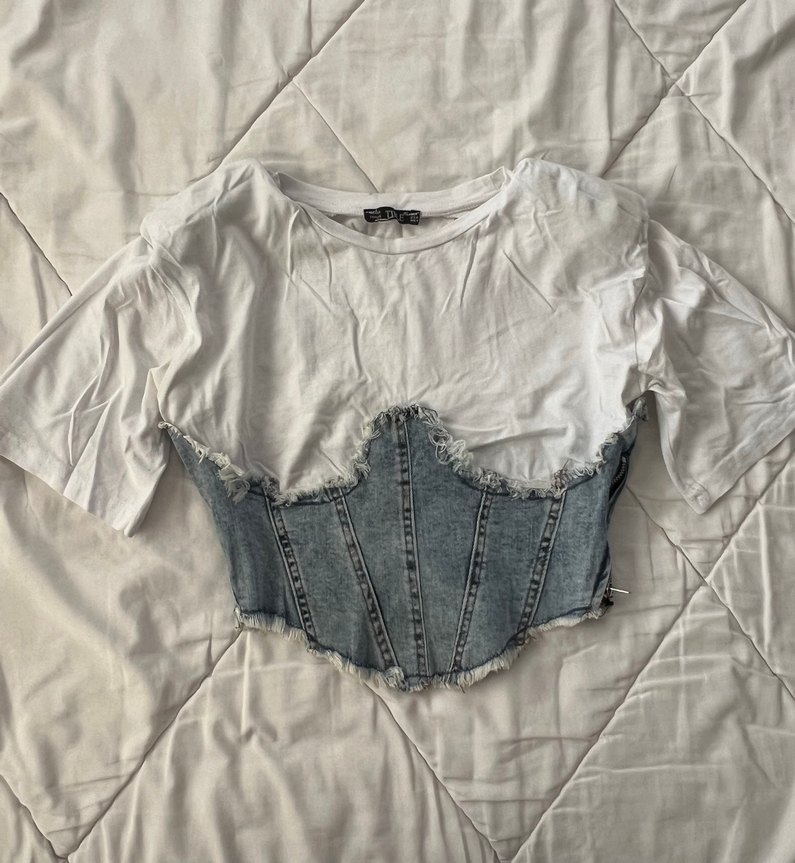 s-m uyumlu üst beyaz kısmı hafif salaş tişört. sadece bir kez giydim yeni gibi. Beyaz kısa kollu, dar kesim tişört, düğmeli kot korsaj detayıyla günlük ve sokak stiline uygun.