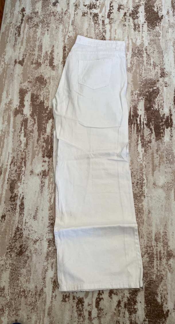 Beyaz kot kumaştan, düz kesim palası ve uzun boyda kadın pantolon. Minimalist ve rahat sokak stili için uygun, günlük kullanımda tercih edilir.