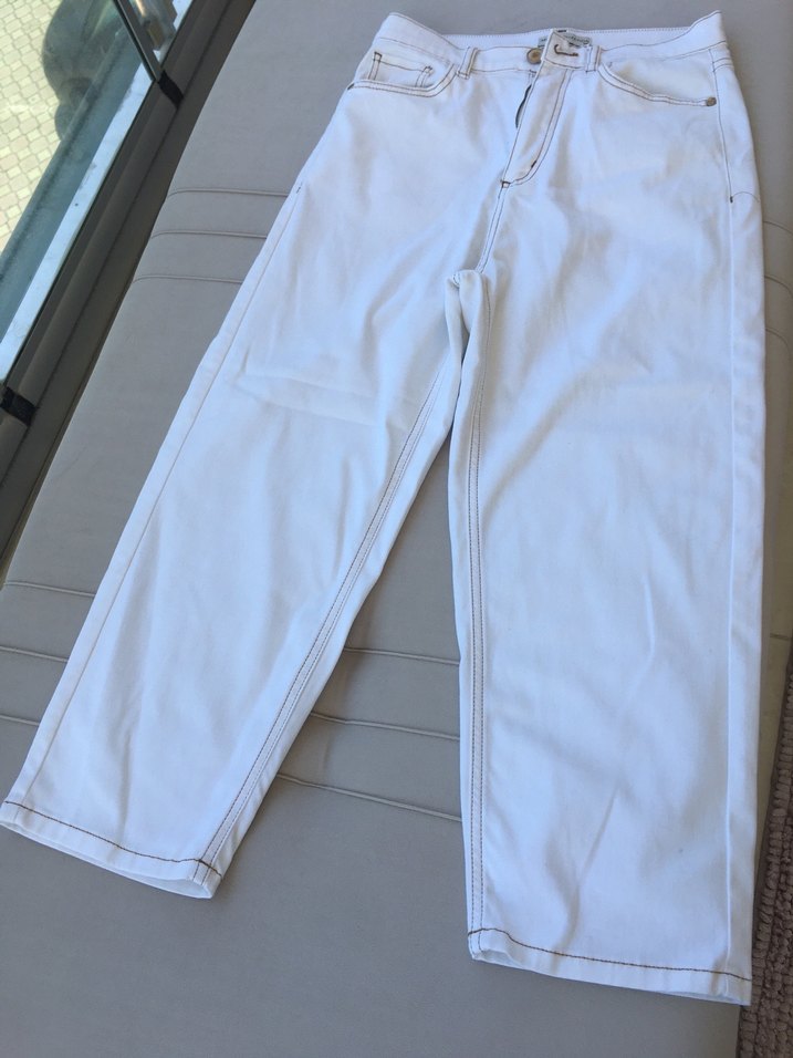 Beyaz midi uzunluğunda, bol kesim ve yumuşak denim kumaştan yapılmış kot pantolon. Minimalist, normcore tarzıyla rahat ve şık bir görünüm sunar. Bel:37cm boy:87cm