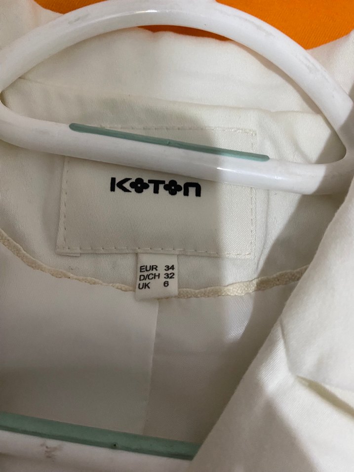 EUR 34, DICH 32 ve UK 6 beden etiketli beyaz Koton gömlek. Hafif renkli kumaş, farklı kullanımlar için uygundur.