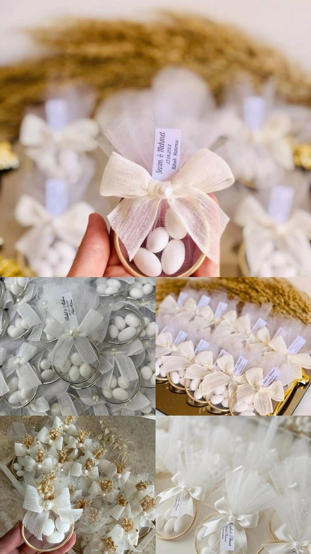 Krem beyaz tonlarda, zarif fiyonklarla süslenmiş nikah şekeri seti, küçük şekerlemeler içerir.