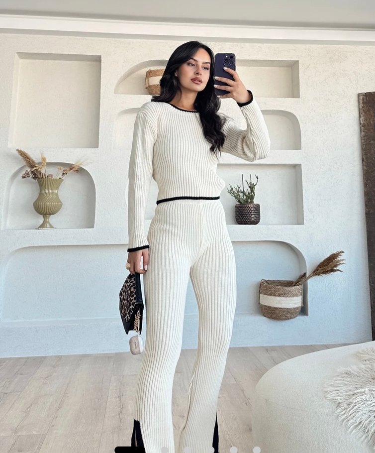 Beyaz-Krem Siyah Detaylı Triko Takımı