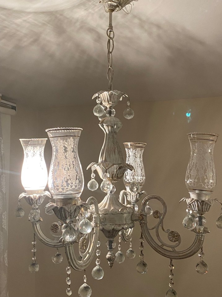 Zincirden sarkan, kristal detaylı ve cam abajurlu beyaz avize. Zarif ve klasik tasarıma sahiptir. Sadece birtane üst kısmında kırık var ama değiştirilebilir 2. Fotoğrafta kırık gösterilmiştir