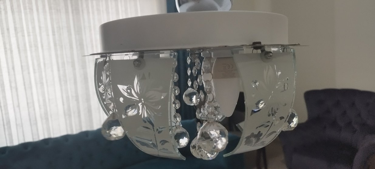 Çiçek desenli ve sarkan kristal boncuk detaylı beyaz avize, şık aydınlatma sağlar. inegöl içi elden teslim kargo ilede göderilir