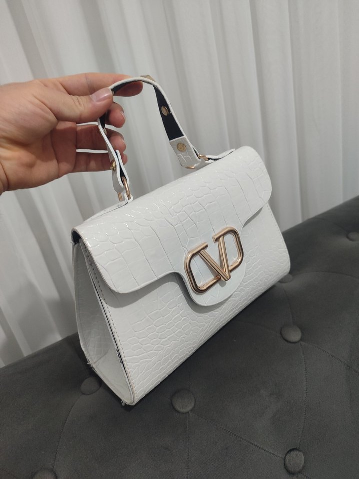 Beyaz renkli, kroko desenli deri çanta, tokalı kapama ve modern klasik tarzıyla günlük kullanıma uygun, minimal ve şık tasarıma sahiptir.
