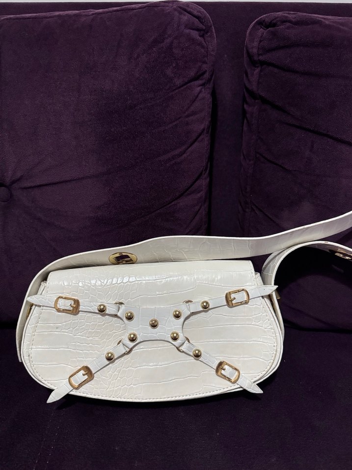 Beyaz deri, krokodil desenli kadın çanta, tokalı kayışlar ve altın tonlu perçin detaylarıyla. Günlük sokak stili için uygun.