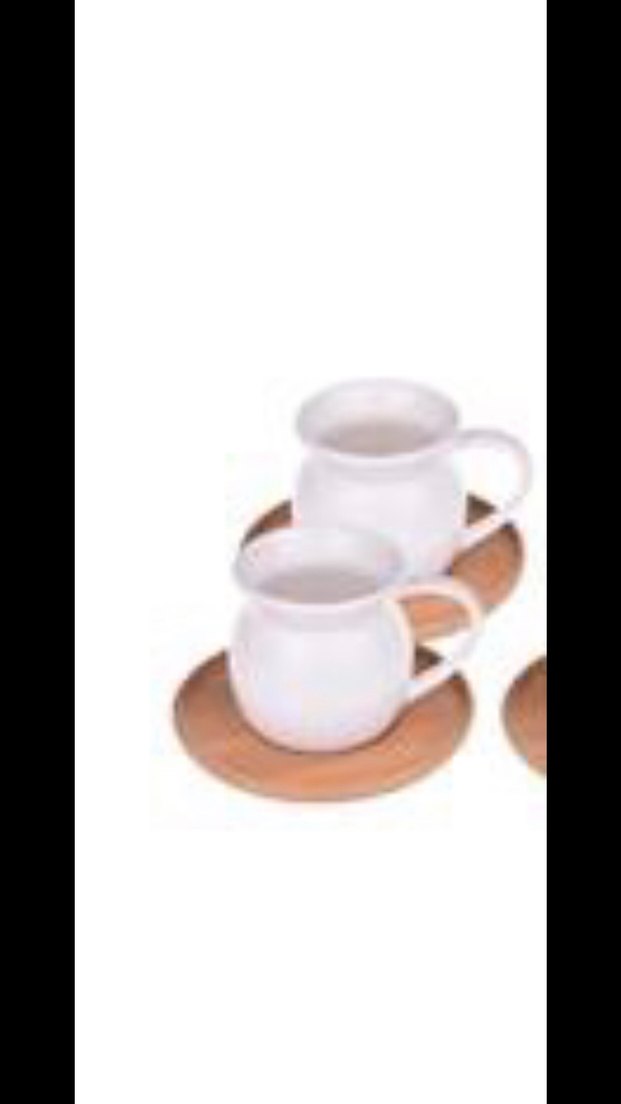 Beyaz kulplu seramik fincanlar, ahşap tabaklarla birlikte sunulur. Sıfır ürün Kutusu yoktur, patpatlanıp gönderilecek İkili fiyat