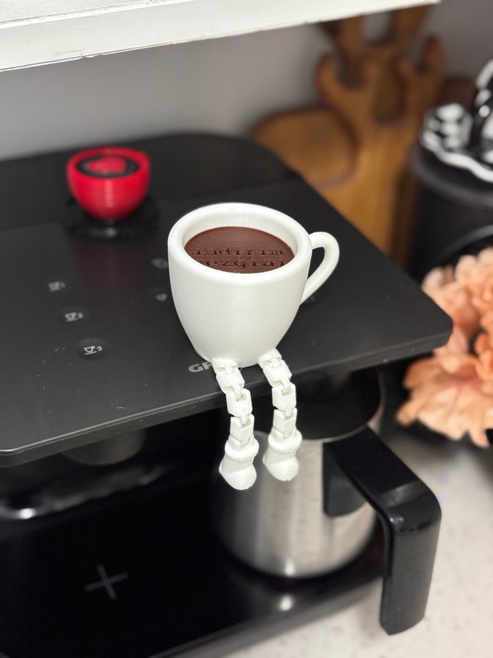 Kahve makinelerine oturan esnek bacaklı beyaz kupa şeklinde kahve köşesi süsü Kahve yapımına eğlenceli bir dokunuş katıyor. ☕