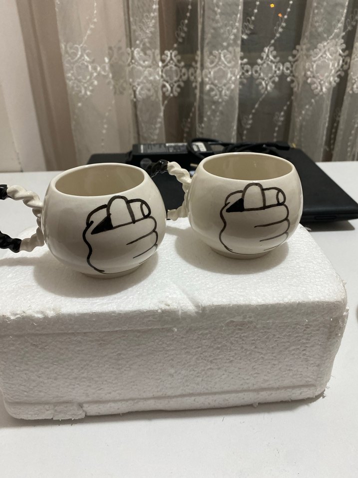 Ön yüzünde koyu el nah deseni bulunan, bükülmüş saplı iki beyaz kupa seti. ☕ nahlı kupa