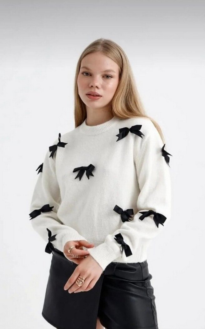 Kadın beyaz örgü mini kazak, uzun kollu ve yuvarlak yaka tasarıma sahiptir. Siyah işleme fiyonk detaylarıyla süslenmiştir, trendyolmilladan alınıp hiç giyilmemiştir