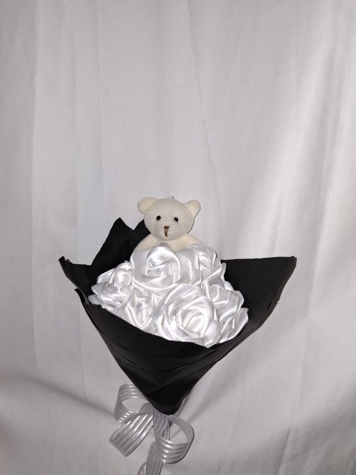Siyah buket kağıdına sarılmış ayıcıklı, beyaz kurdele çiçek buketi. Sevdikleriniz için solmayacak bir buket. Sipariş alınır.
