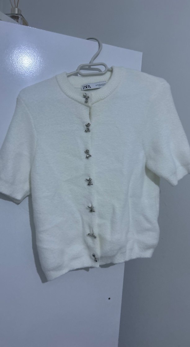 Beyaz, düğmeli kısa kollu triko hırka, yuvarlak yaka ve normal boyda. Trendy ve rahat bir sokak stili parçasıdır.