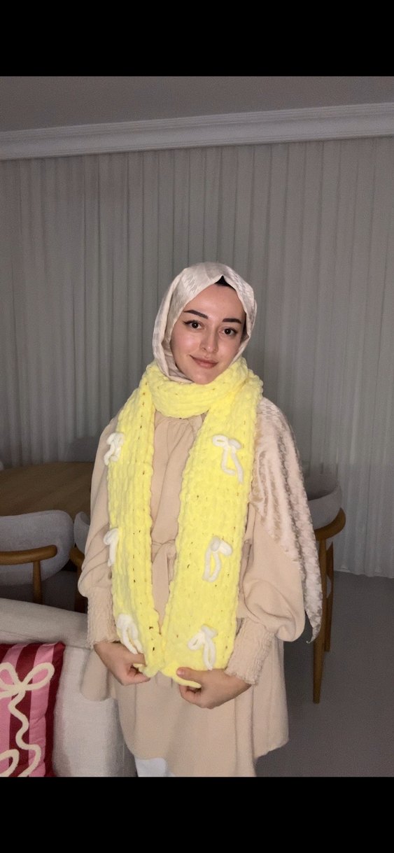 Beyaz kurdele detaylı sarı atkı ve bere seti