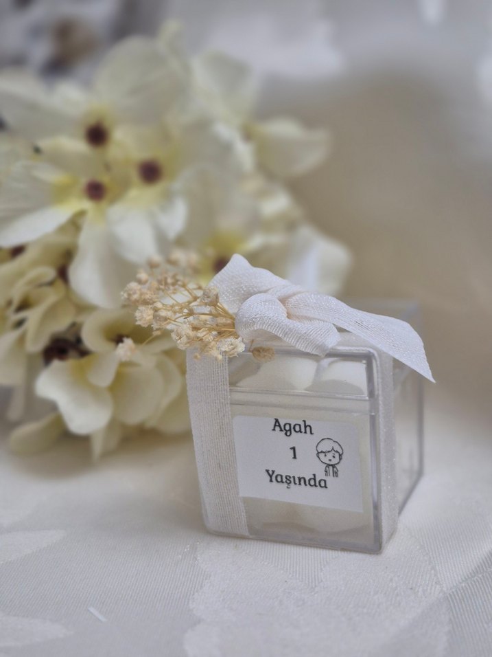 Beyaz küçük hediye kutusu, bubble mum açık renk kurdele ve kuru çiçek süslemelidir. 50 ve üzeri alımlarda 22₺