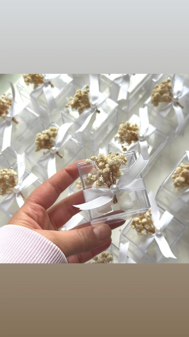 Narin kurutulmuş çiçekler ve inci detaylı beyaz kurdeleyle süslenmiş küçük ayıcık mum hediye kutuları. Özel anlar için uygundur .