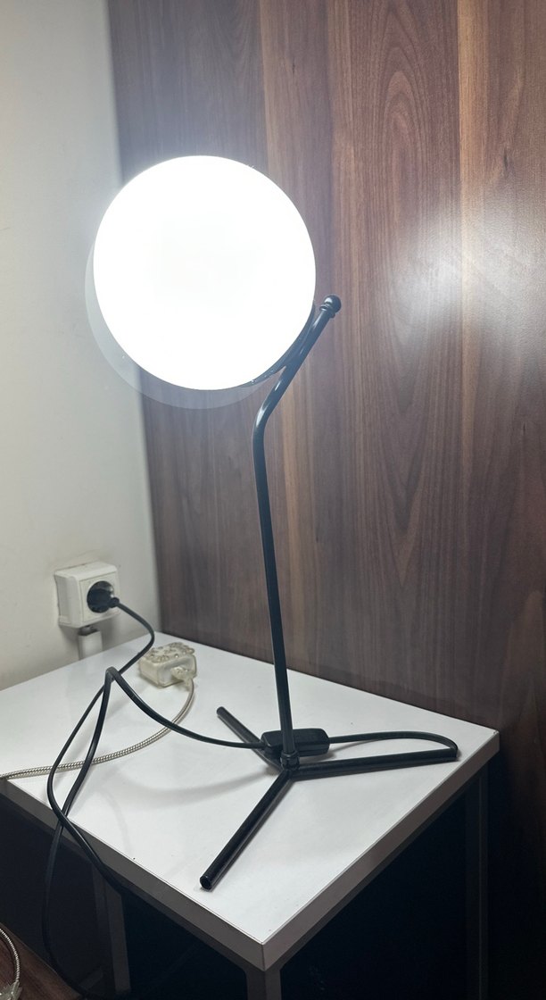 Beyaz küre şeklinde abajur, siyah metal ayaklı ve tabanda güç anahtarı ile modern tasarıma sahiptir. ⚡