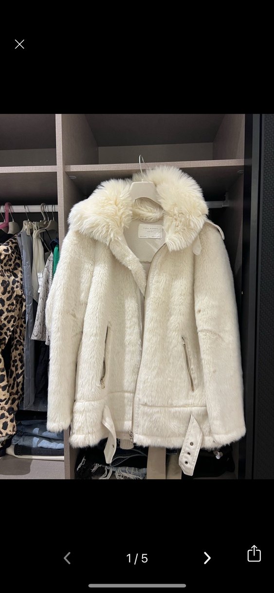 Beyaz, kürk detaylı yakalı, uzun kollu, orta boy, rahat kesim kadın ceket. Yumuşak ve sıcak dokusu günlük sokak stiline uygundur.