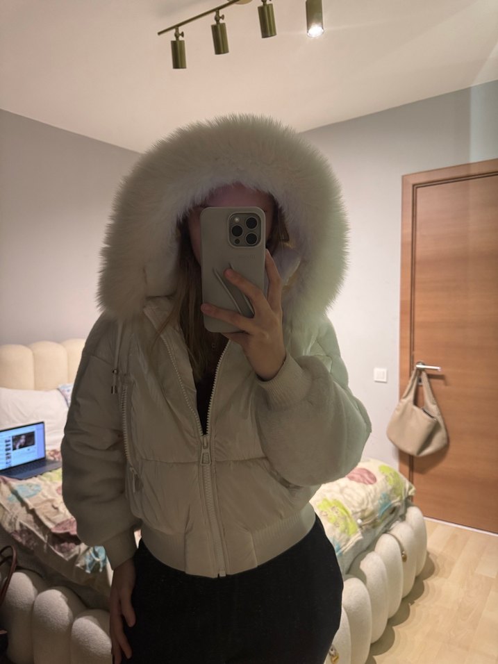 Beyaz Kürk Detaylı Kadın Parlak Mont