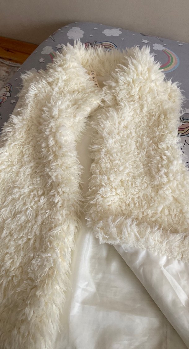 Parlak beyaz suni kürk detaylı, yaka tipi kesik yakalı ve kolsuz, bohem tarzda, günlük kullanıma uygun kadın midi yelek.