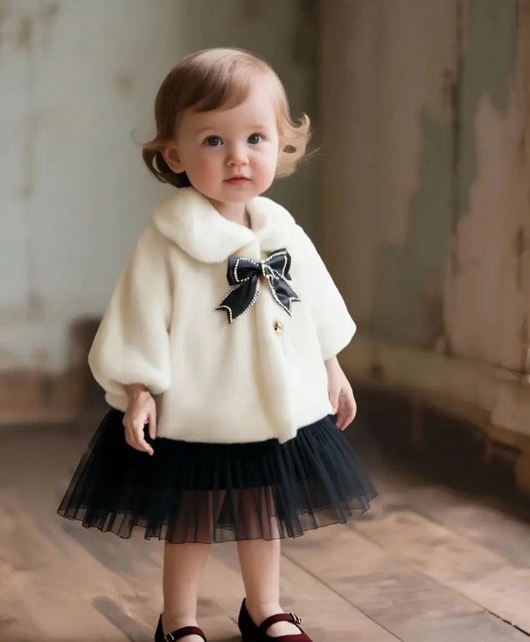Yumuşak ve sıcak kumaşlı, bol kesim, uzun kollu, kesimli yakalı beyaz kız bolero, kürk detaylı ve süslü fiyonklu. ❄️