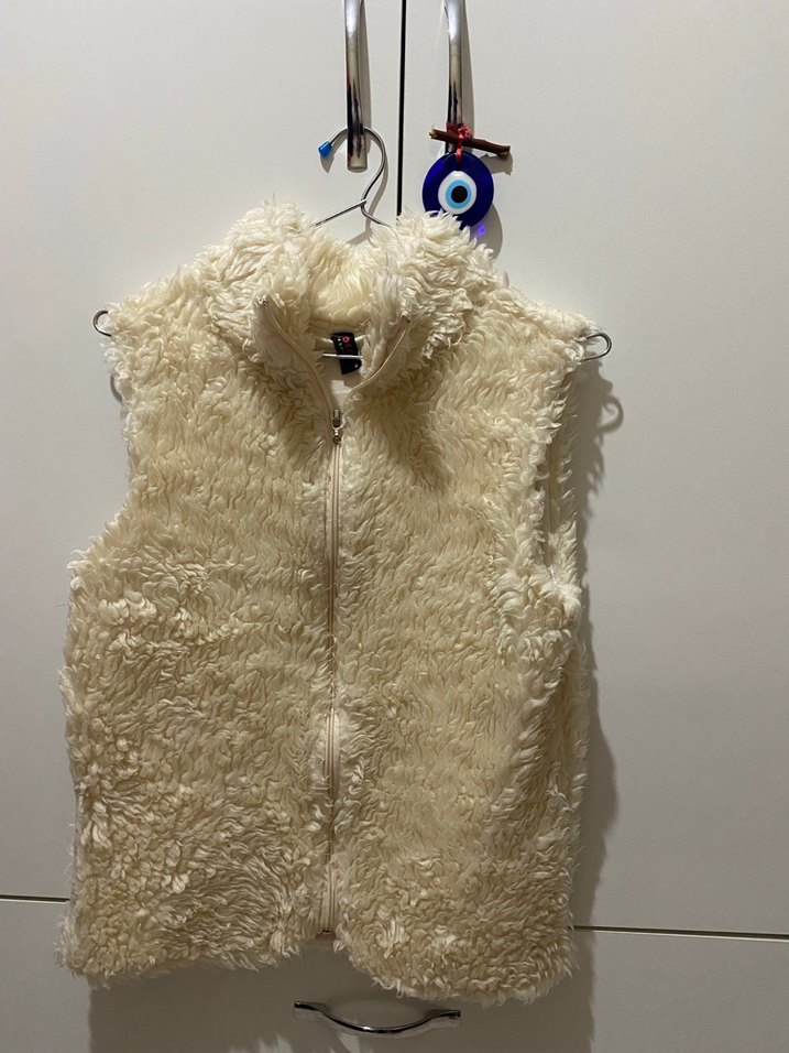 Yüksek yakalı, kolsuz ve beyaz renkte, yumuşak kürk dokusuna sahip, günlük kullanıma uygun, retro tarzda fitted yelek.