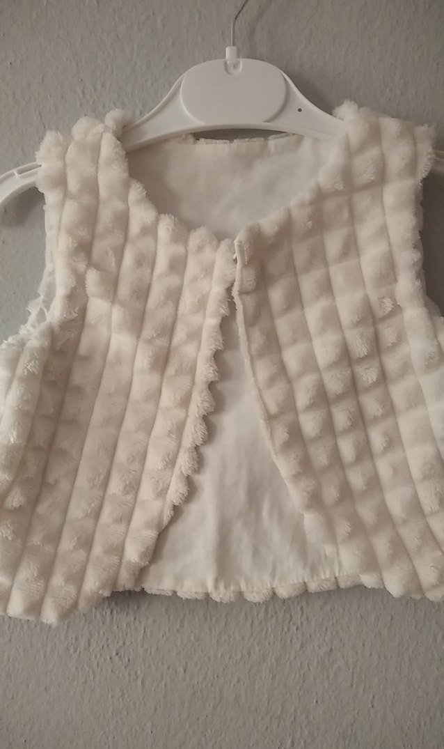 Kolsuz, beyaz kürk detaylı ve V yakalı, yumuşak sentetik kumaştan yapılmış, bohem tarzda fitted kız yeleği.
