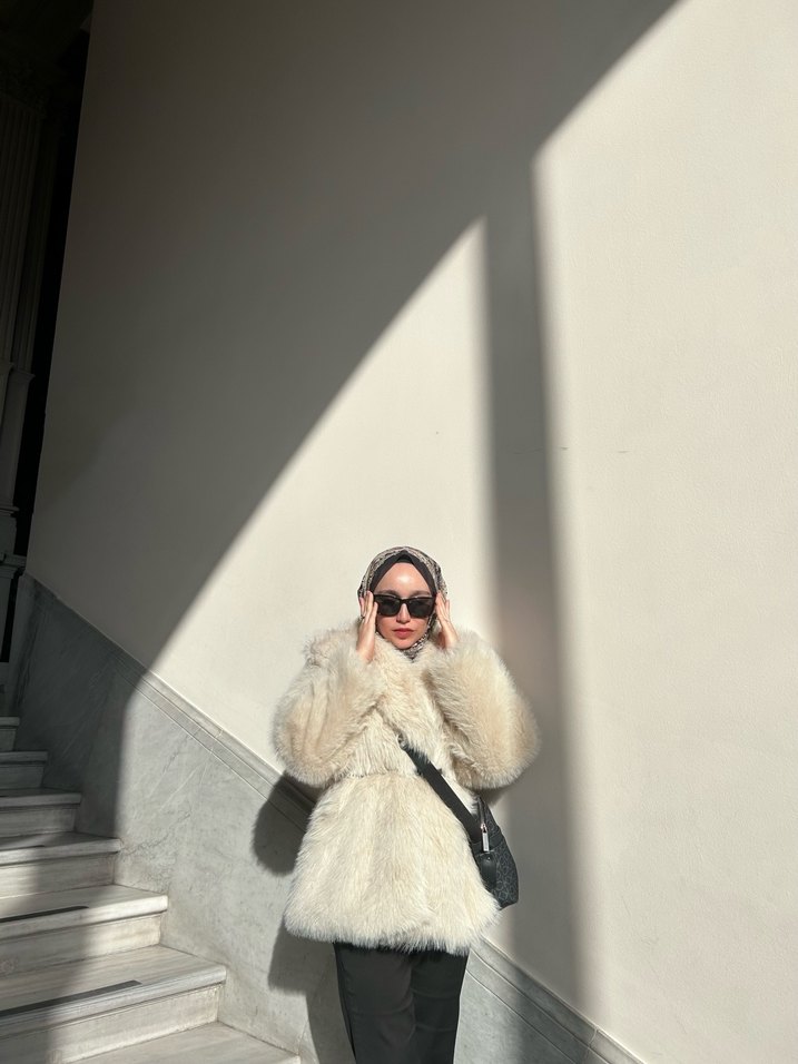 Beyaz renkli, kürk detaylı midi uzunlukta kadın mont. Bol kesim, uzun kollu ve yüksek yakalıdır. Yumuşak ve sıcak kumaştan yapılmıştır, desen içermez.