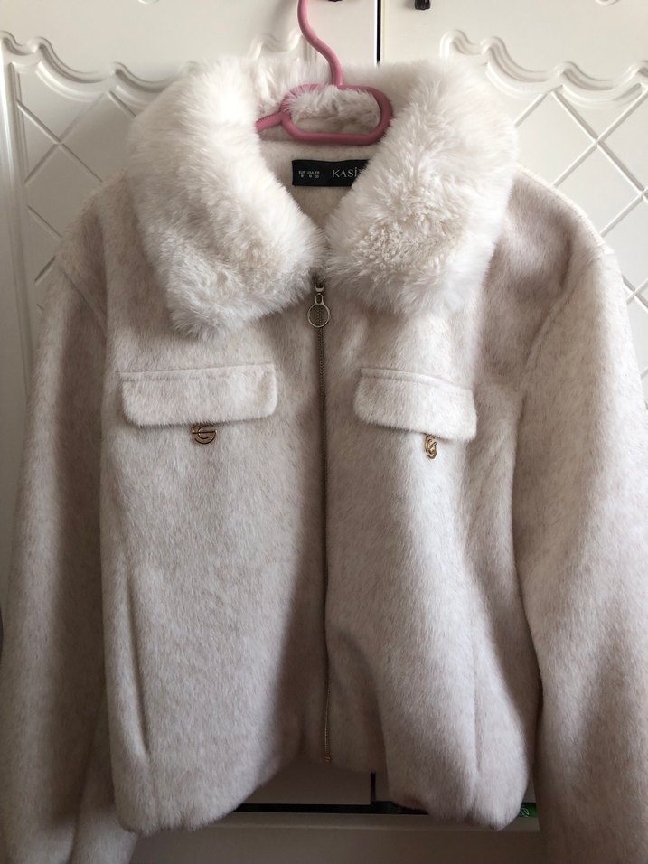 Beyaz renkte, kürk detaylı yakası ve uzun kollu, midi boyda rahat kesimli kadın montu. Yumuşak tüylü kumaştan üretilmiştir ve günlük kullanıma uygundur. Yeni aldım kullanmadım.