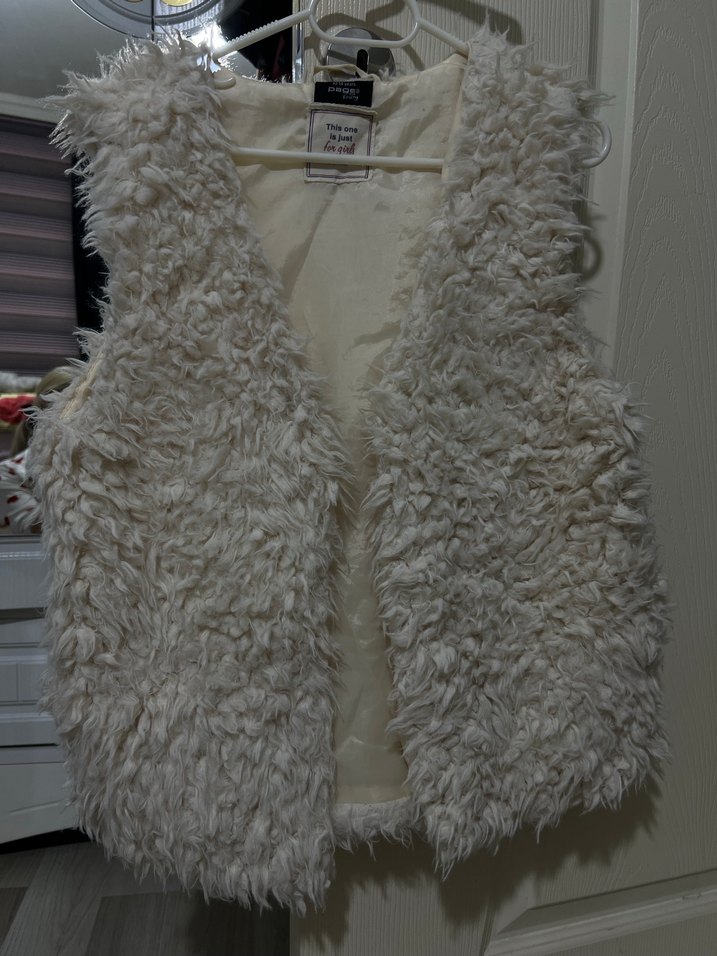 Yumuşak yün kumaştan, kürk detaylı beyaz, v yaka, kolsuz ve dar kesim çocuk yelek. Midi uzunlukta, sokak modasına uygun. Sorunsuz yumuşacık 12 yaştan 14 yaşa kadar uyar