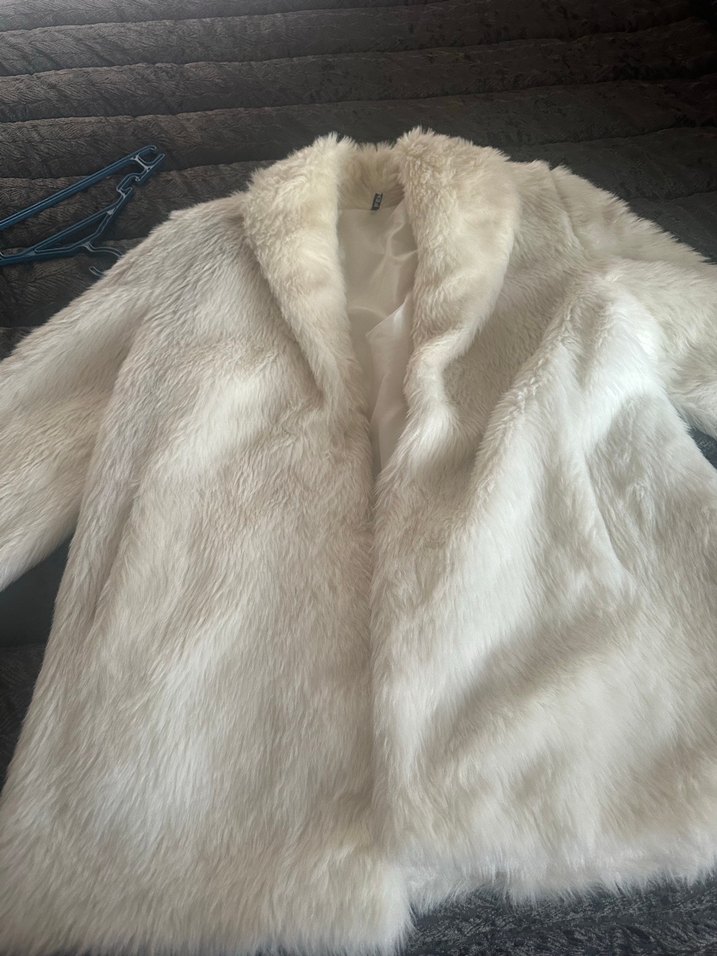 Beyaz kürk midi palto, yumuşak tüylü kumaştan, uzun kollu ve yakalıdır. Rahat kesimiyle sokak stiline uygundur. ❄️kalıbı rahattır m beden fakat L ve XL beden rahatlıkla kullanabilir