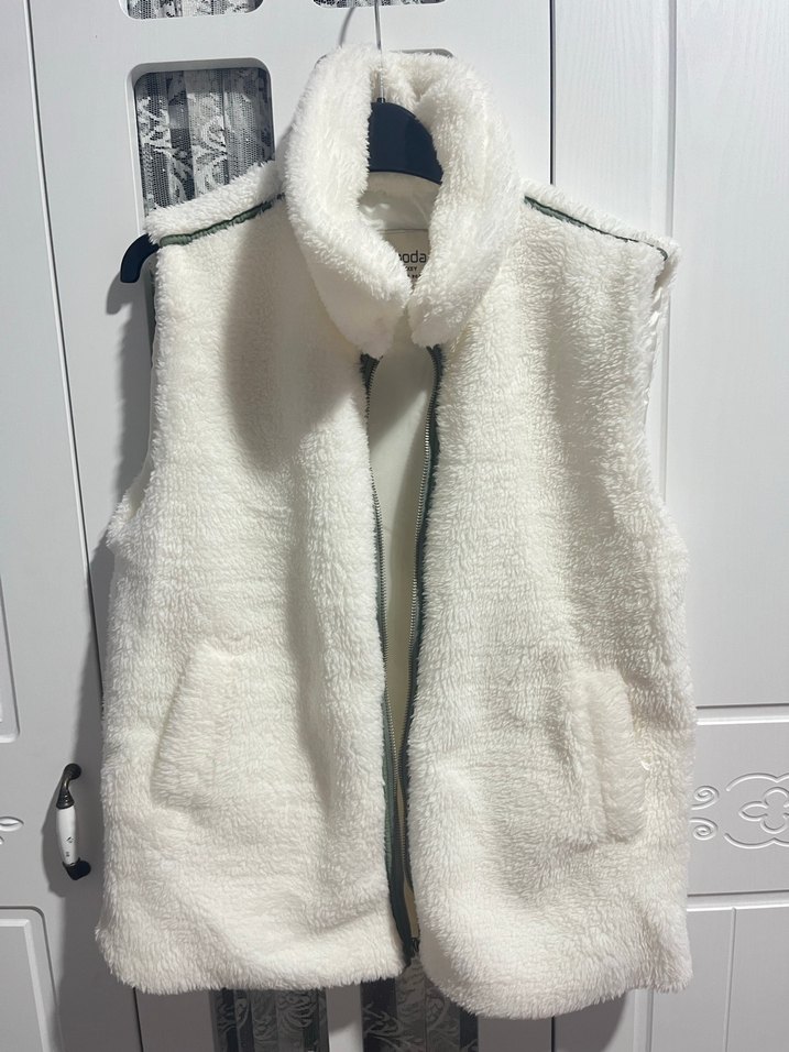 Beyaz, kolsuz yelek, yüksek yakalı ve yumuşak kürk detaylıdır. Günlük kullanıma uygun, fitted kesim ve parlak görünüme sahiptir.