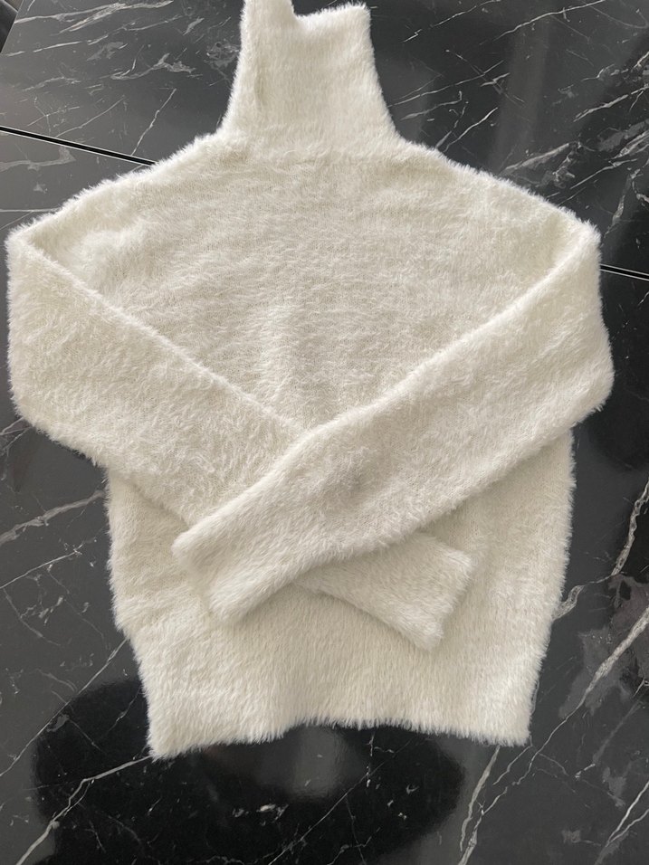 Beyaz, yumuşak kürk detaylı balıkçı yaka, uzun kollu ve yün kumaştan yapılmış, normal boy ve vücuda oturan kadın kazak. Günlük kullanım için uygundur.