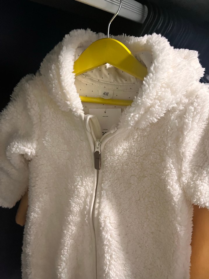 Beyaz renkli bebek kayak tulumu, yumuşak ve sıcak kumaş, kürk detaylı ve kapüşonlu. Önden fermuarlı, desen içermeyen sokak stili. ❄️