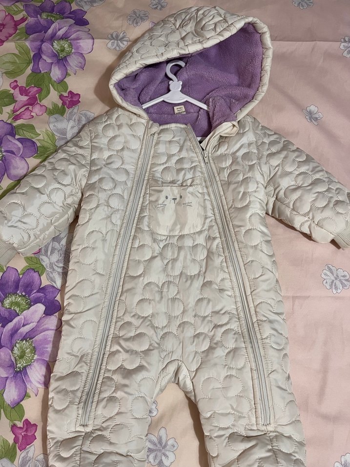 Beyaz, kürklü detaylı, kesik yakalı, kapüşonlu, mor astarlı yumuşak kapitone kumaşlı bebek kız kar tulumu iki kez anca giydi sıfırdan farksız