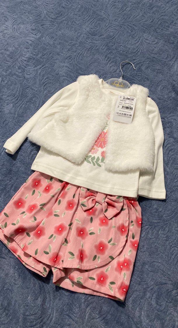 Beyaz uzun kollu üst ve yumuşak kürk detaylı yelek ile pastel tonlarda çiçek desenli fiyonklu şort takımı. Yeni etiketlidir 1-2 yaş